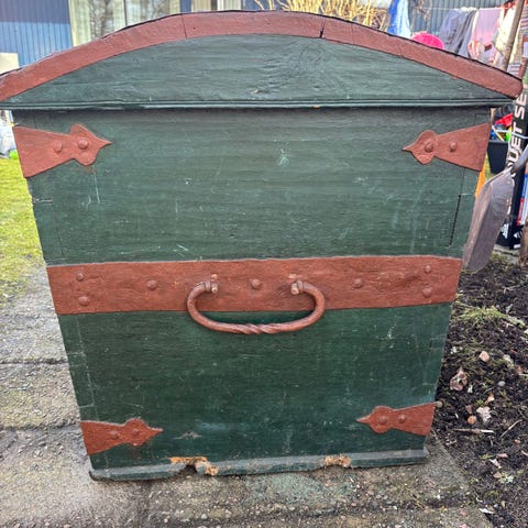 Träkista i brun träfinish. Kistan har gångjärn, låsbeslag på framsidan och metallbeslag i hörnen. Invändigt finns ett mindre innerfack längs ena sidan för förvaring av mindre föremål. På insidan av locket finns målningen "1810". Passar för förvaring av textilier, prylar eller som inredningsdetalj.