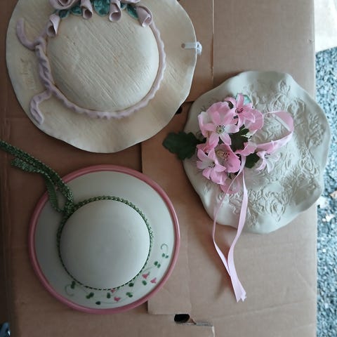 Två stycken broderier med mönster, väv och garn i form av tavlor. Ett av broderierna är påbörjat. Färdig storlek är ca 15cm x 20cm.