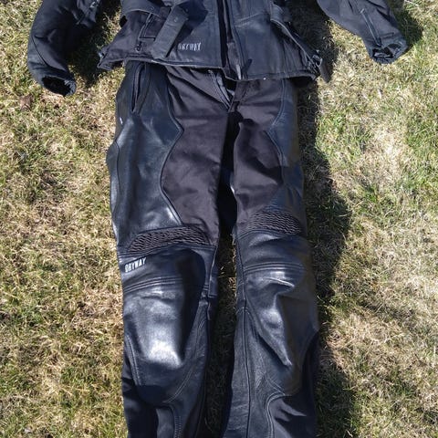 Skinnställ bestående av jacka och byxa i svart skinn. Jackan och Byxorna har flera fickor och förstärkningar vid knän, höfter, armbåge och axlar.