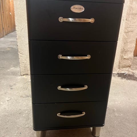 Säljer en svart Tenzo Cobra-byrå med 4 lådor och kromdetaljer. Snygg retrodesign och en modell som inte längre tillverkas, vilket gör den extra kul för dig som söker något lite mer unikt.