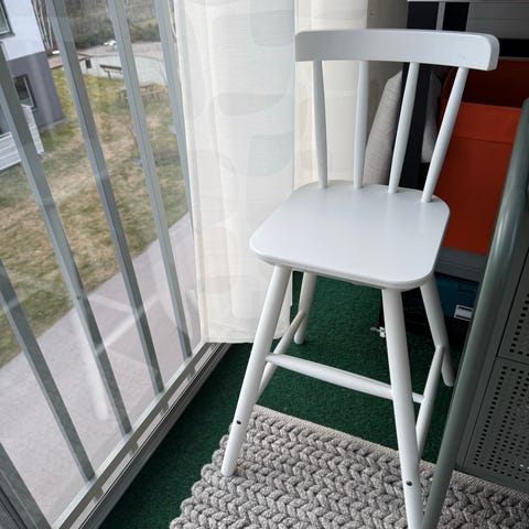 Trästol i vitmålat utförande. Klassisk modell med ryggstöd bestående av tre spjälor och lätt svängd överliggare. Stolen har fyrbent underrede med tvärslåar för stabilitet. Passar som sittplats vid matbord, skrivbord eller som extra stol i hemmet.
