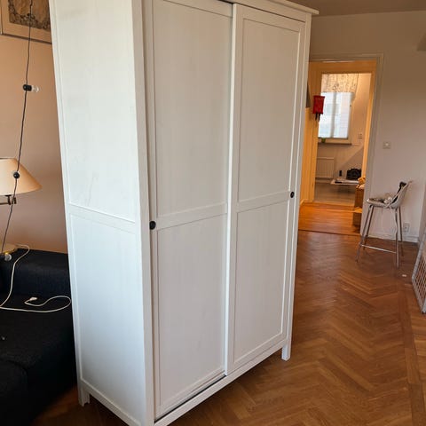 Två delad garderob/klädförvaring med två hyllor (en upp till och en ner till) och upphängning för galgar.