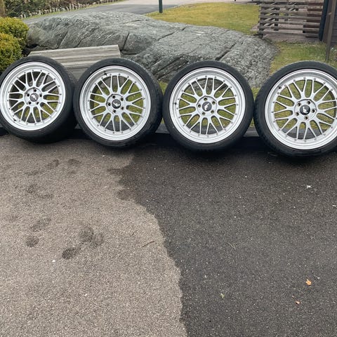 Mk18 med vitt centrum säljes. Köptes nya förra sommaren, finns litet kantskrap och lite nötta däckkanter på två däck. I övrigt fint skick, bra mönster osv. (5/108) (215/35)