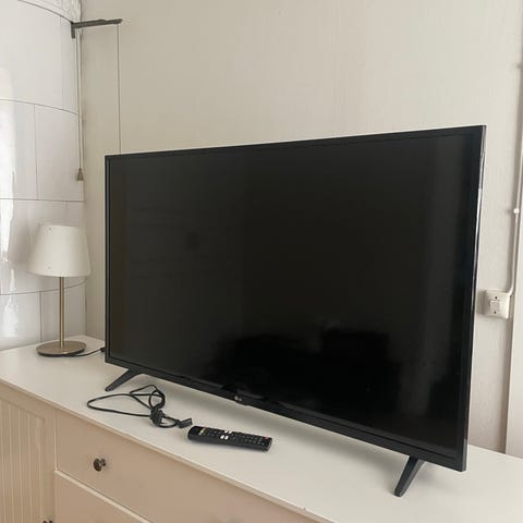 Samsung TV med platt skärm. TV:n har en rektangulär fot i metallfärg och svart ram runt skärmen. Passar för användning i vardagsrum, sovrum eller andra utrymmen där man vill ha en fristående TV på bänk eller hylla. 48tum numer 0709312558