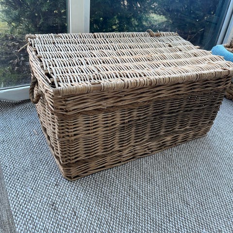 Det här objektet är en rottingkista med lock, en klassisk förvaringsmöbel som ofta används för textilier, leksaker eller som tvättkorg.