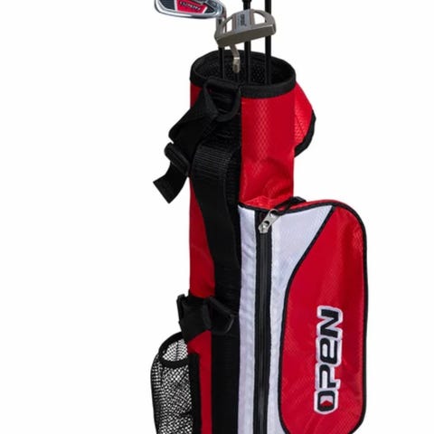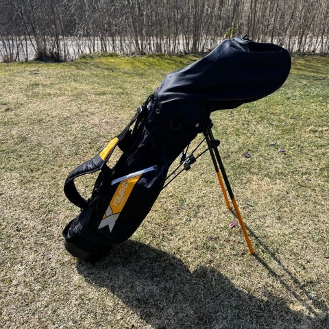 Open FGC III junior golfset med bag i gul och svart färg. Setet innehåller flera klubbor, bland annat järnklubbor och woods/hybrider, anpassade för juniorer. Golfbagen är en ståbag med tvåbensstativ, bärremmar och flera fack för klubbor och tillbehör. Passar yngre spelare som behöver ett komplett set med matchande bag.