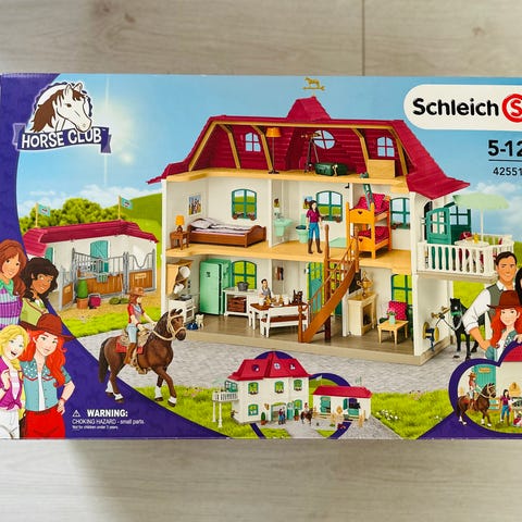 Schleich Horse Club hästtransport lekset. Innehåller lastbil med hästtransport och utfällbara delar som skapar en stall- och lekmiljö. Setet omfattar hästfigur, ryttare och flera tillbehör som sadel, träns, hinder och stallutrustning. Rekommenderad ålder enligt förpackningen är 5–12 år. Passar för lek med andra figurer och set i Schleich Horse Club-serien.