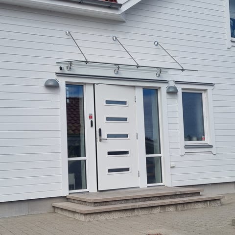Vit ytterdörr med rektangulär glasruta i övre delen. Dörren har dekorativa speglar på insida och utsida ( handtag och låscylinder ingår ej) . Passar som entrédörr till villa, fritidshus eller liknande där man önskar ljusinsläpp genom glasöppningen. Karm ingår ej, mått med karm 10×21.