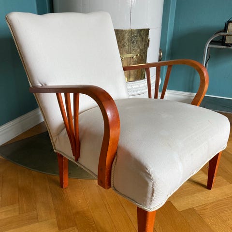 Välvårdad karmstol/fåtölj från troligt 1960-tal. Stomme i vackert betsat trä och originalklädsel i gammalrosa sammet/plysch. Lösa kuddar med knappar. Stabil och bekväm.
