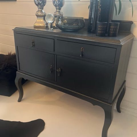 Fint sideboard målat med Annie Sloan färg ” Country Grey ” och vaxad med deras antikvax vilket ger en slitstark yta .