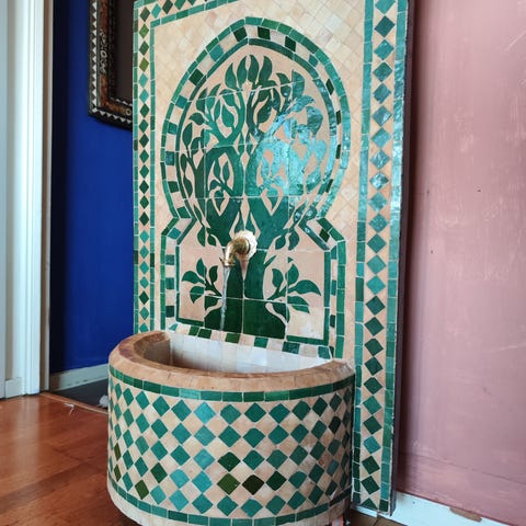 Vacker handgjord fontän med färgstark mosaik och mässingskran. Inbyggd vattenpump som ger ett lugnt, porlande vattenljud (slutet system – bara att fylla på vatten och koppla in el). Passar både inne och ute, perfekt för trädgård, balkong eller spa-känsla hemma.