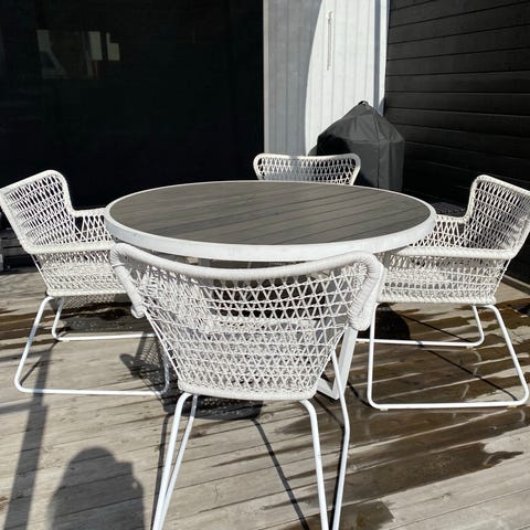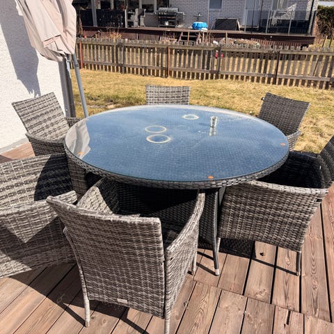 Matgrupp utomhus runt bord med 6 stolar grå konstrotting