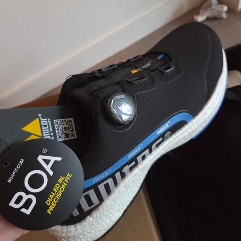 Monitor Paradox R arbetsskor i storlek 45. Modellen är en skyddssko med svart ovandel och vit sula. Skorna har BOA-snörningssystem och är märkta som safetyshoe S1P S HRO FO ESD SR enligt etiketten på kartongen. Lämpliga som skydds- och arbetsskor i miljöer där halkskydd, tåskydd, spiktrampskydd och ESD-egenskaper behövs.