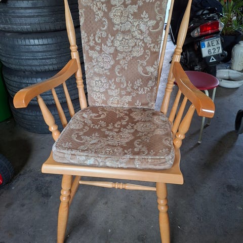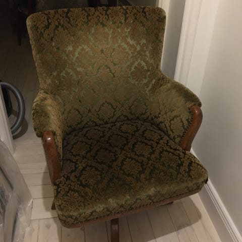 Stabil fåtölj förmodligen från 1950-talet, slitet tyg på sitsen och på ryggstödet. Kan användas, men ser bättre ut om filt eller fårpäls läggs på (ingår inte i köpet). Eller så är fåtöljen lämpligt objekt för den som vill renovera.