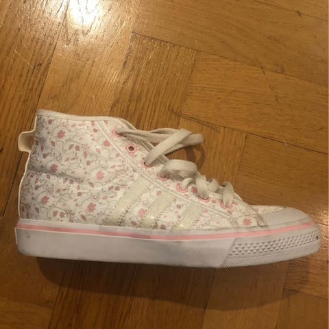 Adidas sneakers i storlek 38. Oanvända. Skorna är svartvita med klassiska Adidas-ränder på sidorna och vit yttersula med brun undersida. Ovandel i textil och syntet med snörning framtill. Passar för vardagsanvändning och fritidsaktiviteter.