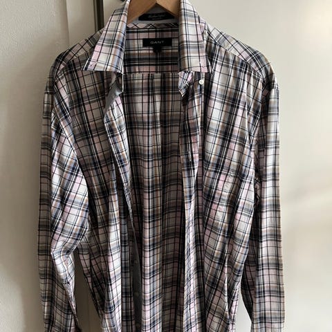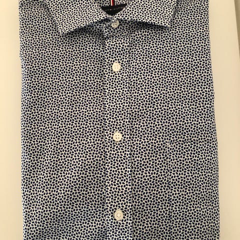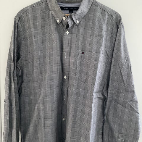Tommy Hilfiger New York Fit skjorta för herr i storlek L. Skjortan är vit med blått rutmönster och tillverkad i bomull. Långärmad modell med krage och knäppning framtill. Passar till vardag och mer uppklädda tillfällen.