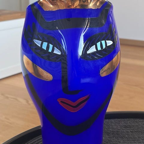 Vas i glas med svartvit dekor. Vasen har ett mönster med stiliserade ansikten och former runt hela kroppen. Passar som inredningsdetalj eller för snittblommor och grenar. Tillverkad i glas med tryckt eller målad dekor i svart mot en ljus bakgrund. 21 cm hög