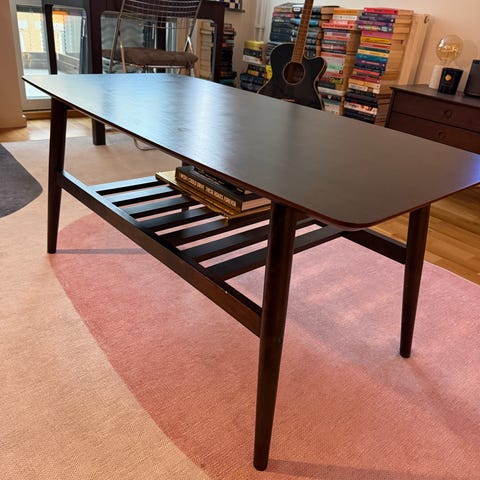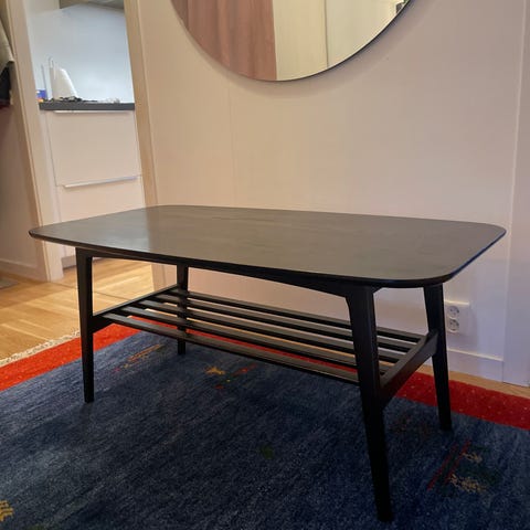 Säljer ett svart soffbord på grund av flytt. Köpt på Mio och i mycket bra skick. 130 cm långt, 70 cm brett och 47 cm högt. Finns även avlastning hylla under.