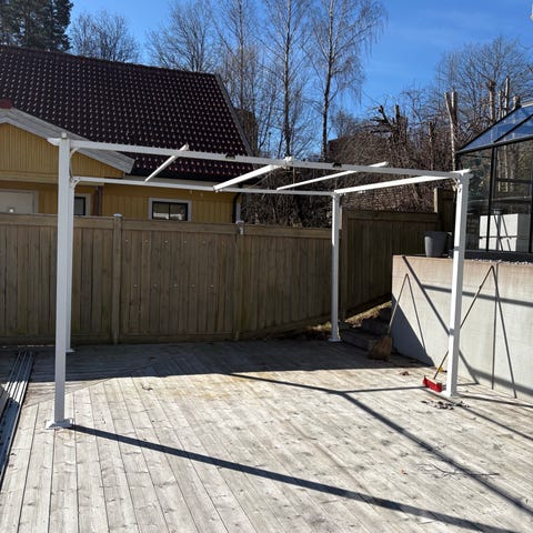 Pergolan är i bra skick och säljs nermonterad för smidig transport. Som bonus ingår även ett helt nytt tygtak som aldrig har använts – perfekt att ha som reserv eller att byta till direkt.