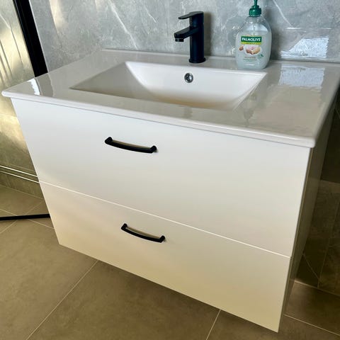 INR Air Solid 120 A kommod i färgen Premium White. Väggmonterad badrumskommod med bredd 120 cm. Modellen har två lådor på höger sida och öppen hyllförvaring på vänster sida. Avsedd för ovanpåliggande tvättställ och blandare.