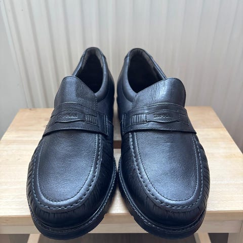 Rockport loafers herrskor i storlek 44. Skorna är i brun färg och har en klassisk loaferdesign med slät ovandel och markerad söm runt tån. Modellen passar för vardagsbruk och mer uppklädda tillfällen. Yttermaterialet är i ett slätt, glansigt material som ger ett stilrent intryck. Skorna är av typen loafers och seglarskor, med låg klack och slip-on-modell utan snörning, vilket gör dem enkla att ta på och av.