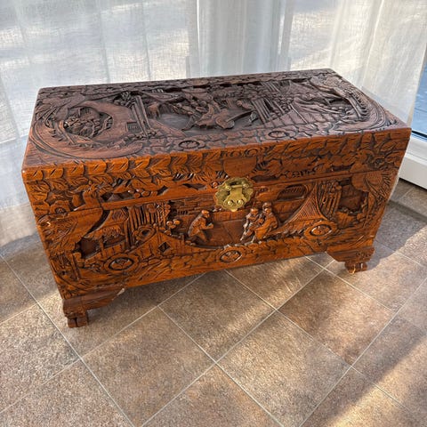 Antik Indisk rustik byrå/brudkista sk damchiya i vackert patinerad teakträ,snidade detaljer och dekorativa paneler på dörrar och fronter. Skåpet har en större dörröppning framtill, med metallbeslag och ringhandtag. Rikligt snidad ram runtom och dekorativ nederkant. Passar som förvaringsmöbel eller som sidobord i vardagsrum, hall eller matsal.