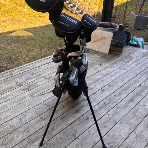 Open junior golfset med bag i svart och blå färg. Setet innehåller flera klubbor, bland annat driver, järnklubbor och putter, anpassade för juniorer. Golfbagen är en ståbag med bärremmar, flera fickor för tillbehör samt integrerat bärstativ för att kunna ställas upp på marken. Passar för juniorer som vill ha ett set med klubbor och bag för spel på range och bana.