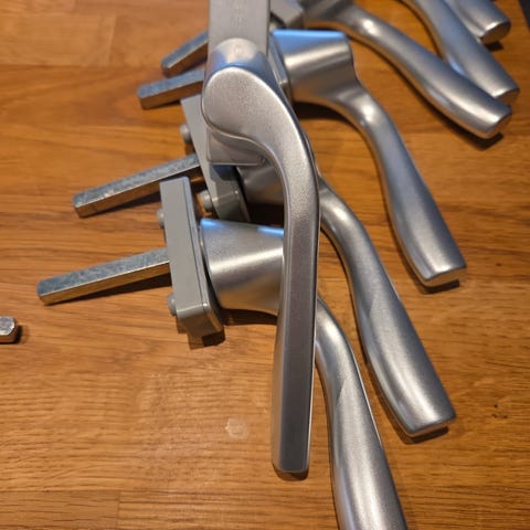 Fönsterhandtag Hoppe 2st vänster innomhus 2st höger innomhus varav en med plats för låscyöinder och 1st rak utomhus Aluminium