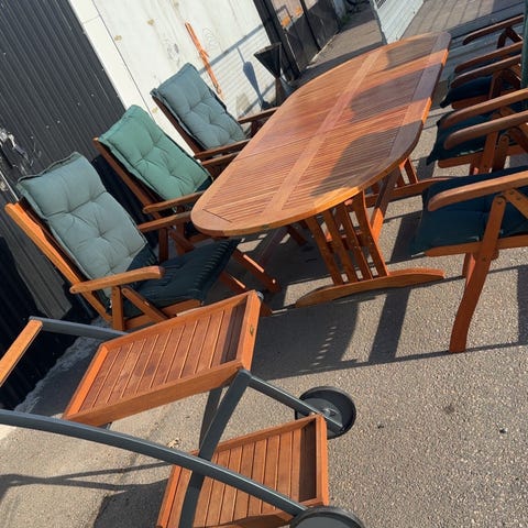 Trädgårdsgrupp bestående av runt bord och fyra stolar med blått sittundelag