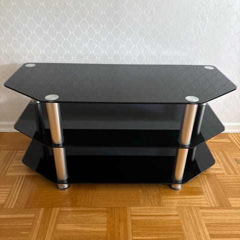 Svart Tv-möbel med grå pelare på hjul. Fint skick men naggad färg överst i ett hörn se bild. Borde kunna fixas med lite svart färg.