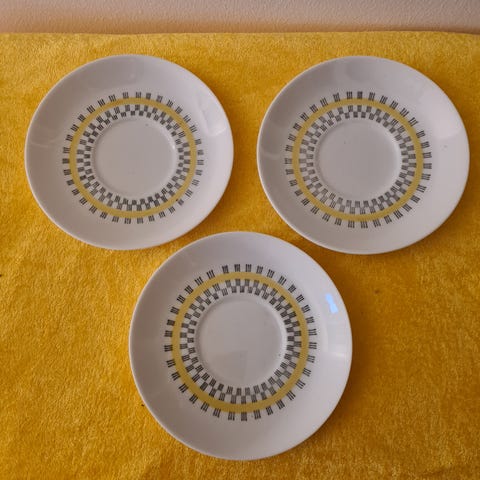 Dessa vintage tekoppar med fat är från Upsala-Ekeby Gefle och är i Gavott-mönstret, formgivet av Helmer Ringström och Sven Eric Skawonius.