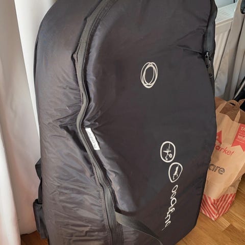 Bugaboo resväska till barnvagn i svart färg. Väskan är utformad för att rymma en hopfälld Bugaboo-barnvagn och tillbehör under transport. Den har dragkedjeöppning längs sidan för enkel i- och urpackning, bärhandtag upptill samt hjul i nederkant för att kunna rullas. Passar för förvaring och resa med barnvagn, exempelvis vid flyg- eller bilresa.