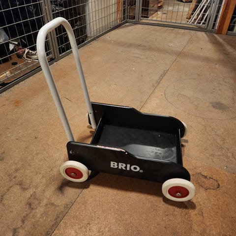 Inovi gåvagn i trä med fyra hjul. Vagnen har svart chassi med turkosa detaljer och naturfärgade sidostycken i trä. Handtaget är anpassat för små barn som lär sig gå och vagnen har en öppen lastyta framtill för leksaker eller andra småsaker. Passar som stöd vid barnets första steg och som enkel leksaksvagn inomhus.