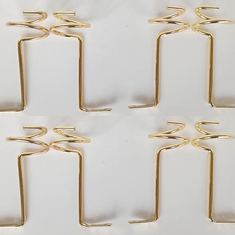Ringar till runda gardinstänger. Gardinerna fästes med klämmorna. Ringarna är av två sorter, typ A och B som är nästan lika. 32 st ringar tillsammans, 16 av varje (bilden visar inte alla 32). Storlek diameter typ A: innermått 3,6 cm och yttermått 5,3 cm, typ B: innermått 3,9 cm och yttermått 5,8 cm. Ringarna är något urblekta och har en del färgskiftningar och repor.