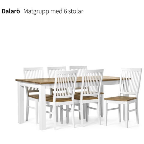 Mio matgrupp med matbord och 8 stolar i trä. Iläggskiva ingår. Märke Dalarö. Bord med rektangulär bordsskiva i ek och vitt underrede. Tillhörande stolar med sits i ek och vitlackad stomme med ribbad rygg. Passar som matplats i kök eller vardagsrum. Visst slitage på stolar men kan lätt målas i med vit färg.