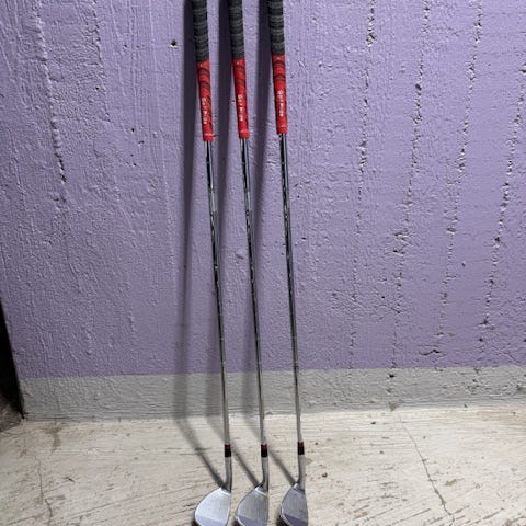 6 klubbor, 5-P. Förlängda ½ tum. Golf Pride mid-size grepp. Använda men i ok skick (se bilder). Skaftet på PW är bytt till ett liknande original.