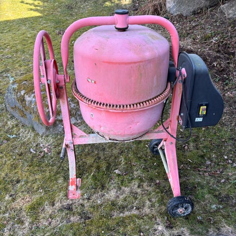 Betongblandare i röd färg. Monterad på stativ med hjul för enklare förflyttning. Utrustad med manuell snurrmekanism via ratt för att luta trumman vid fyllning och tömning. Lämplig för blandning av betong, murbruk eller andra massor vid bygg- och renoveringsarbeten utomhus eller i garage. Funkar bra