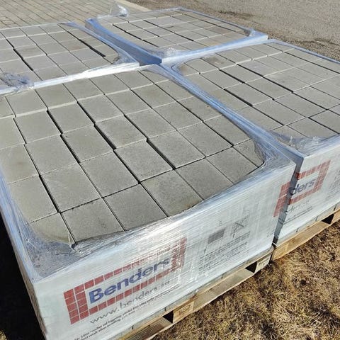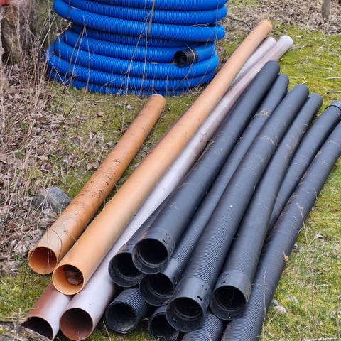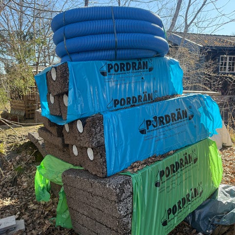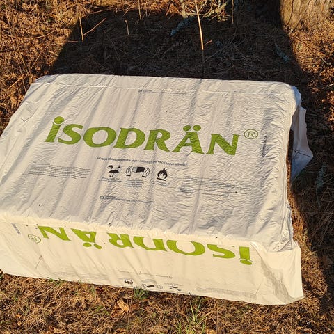 Sex paket plus fyra lösa skivor Optidrain® skivor 100 mm, som blev över efter dräneringen. Varje paket innehåller 4,5 kvm.