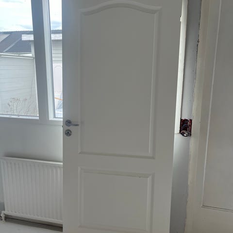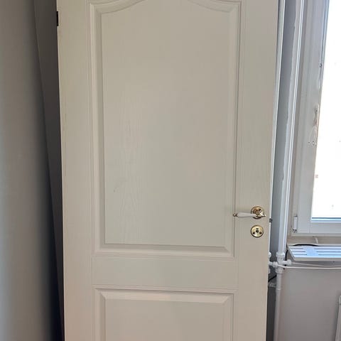 Vita innerdörrar med spegeldesign och klassisk profil. Dörren har monterat dörrhandtag och nyckelhål. Mått 7x20 och 8x20