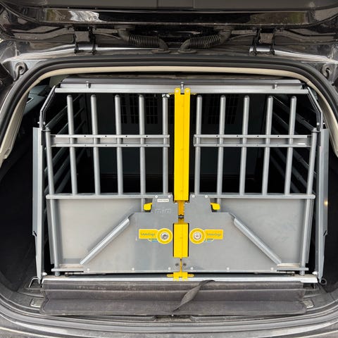 Variocage hundbur äldre modell i metall med madrass och medföljande skyddsmatta. Buren har gallerfront med låsbar dörr, hel demonterbar bakvägg och täckt tak. Skyddsmattan är anpassad att placeras framför eller under buren för att skydda bilens stötfångare. Buren är ställbar i djup 810-1030 mm, bredd 700 mm, höjd 715 mm.