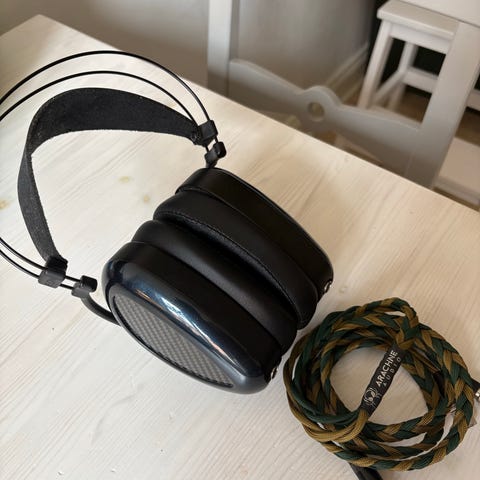 iBasso Audio SR2 hörlurar over-ear i svart och silver. Öppen konstruktion med stora, rundade kåpor och vadderade öronkuddar i perforerat material. Justerbart huvudband med läderliknande ovansida och metallbyglar. Levereras med avtagbar kabel (3.5 mm / 6.35 mm), ett par extra och förvaringsfodral enligt bilder. Passar för lyssning hemma, på kontoret eller i studio med högupplöst ljudkälla.