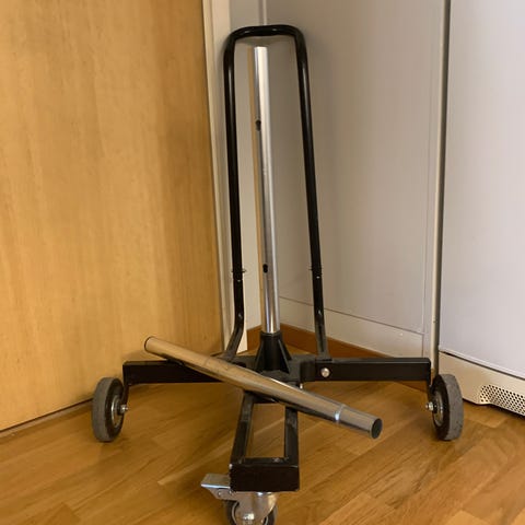 Praktisk hjulhållare med hjul för enkel förflyttning. Framhjulet kan låsas för ökad stabilitet vid förvaring eller transport.