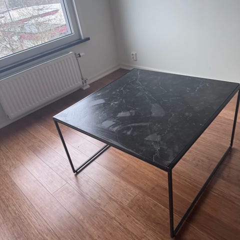Mio soffbord i sats med två bord. Borden har fyrkantiga bordsskivor med marmormönstrad yta i ljus ton och underrede i svart metall med raka, öppna ben. Passar som soffbord eller sidobord i vardagsrum eller andra sällskapsytor. Bordsskivornas storlek och exakta mått är inte angivna.
