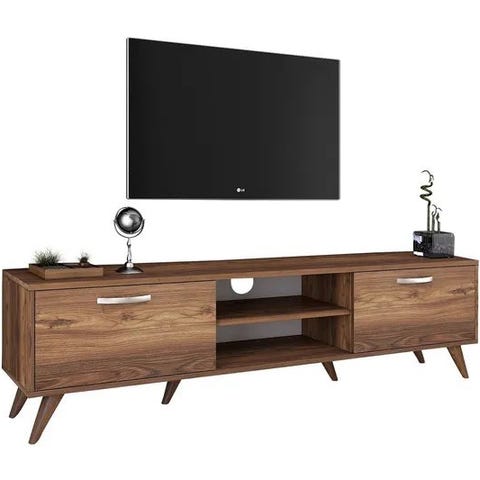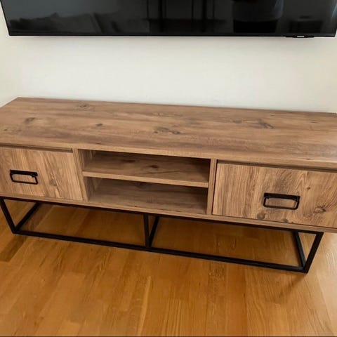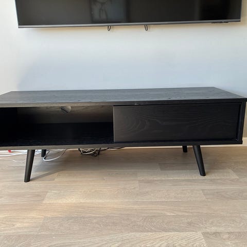 Vi säljer vår tidigare tv bänk. Den är svart med valnötsdetaljer på dörren och två vertikala avskiljare.
