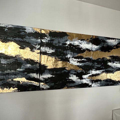 En kraftfull abstrakt målning med en dynamisk och explosiv struktur som drar blicken direkt till centrum. Detaljerna i bladguld skapar ett lyxigt ljusspel och en känsla av energi, styrka och elegans mot den mörka bakgrunden.