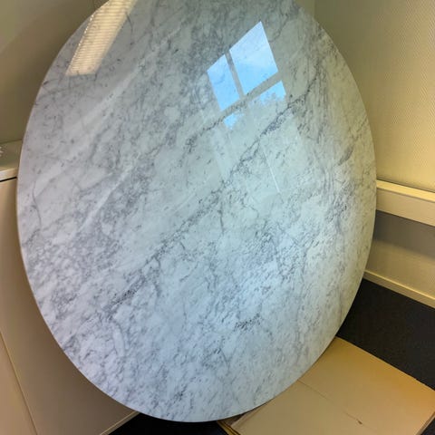 Snyggt marmorbord säljes-passade tyvärr inte i vårt kök! Höjd 75 cm, 105 cm i diameter.