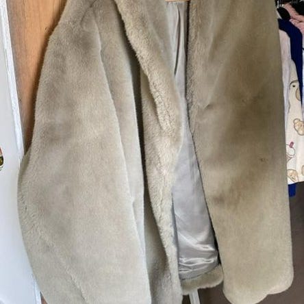 Reserved jacka i fuskpäls för dam i grå färg, storlek M. Jackan har mjuk, lurvig utsida och slät fodrad insida. Modellen är en kortare jacka med krage och lång ärm, lämplig som ytterplagg under svalare väder.