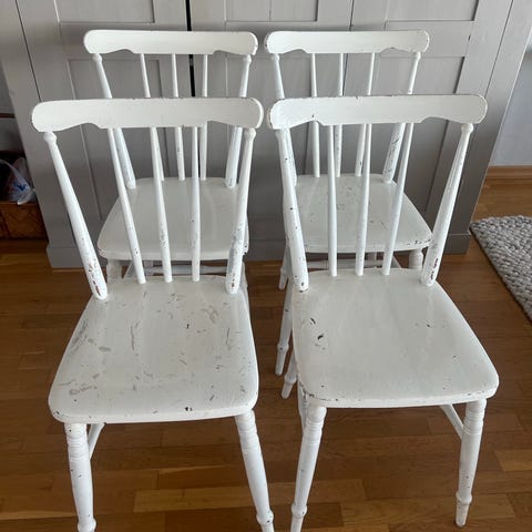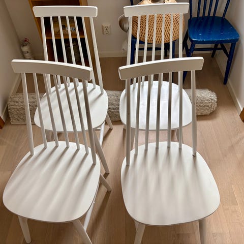 Hagafors pinnstolar i trä, målade i ljusgrått. Klassisk modell med rundad sits och rygg med flera pinnar. Passar som matstolar eller extra sittplatser i kök, vardagsrum eller hall. Tillverkade i Sverige enligt märkning på undersidan av sitsen.