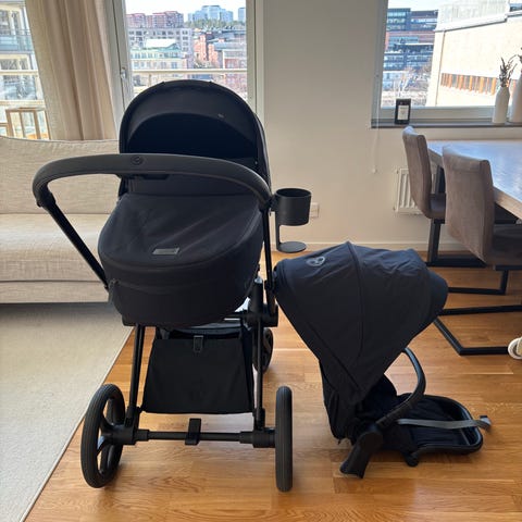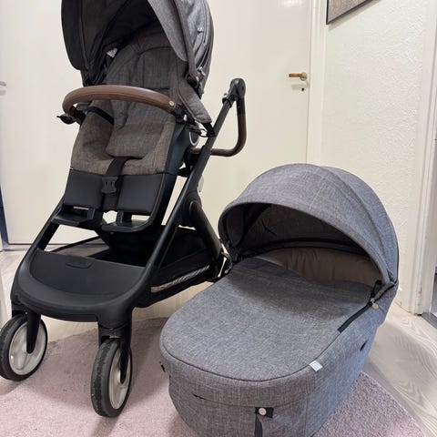 Stokke barnvagn med liggdel och sittdel djupsvart.