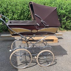 Emmaljunga barnvagn. Klassisk modell med kromat chassi, fyra fasta hjul och fotstöd. Handtaget är böjt med grepp i ljust material. Vagnen har liggyta med ljus klädsel och sidostycken i kontrasterande färg.